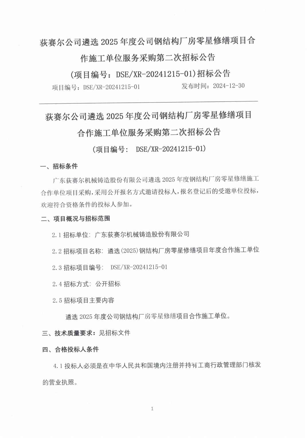 遴选2025年度公司钢结构厂房零星修缮项目合作施工单位服务采购第二次招标公告