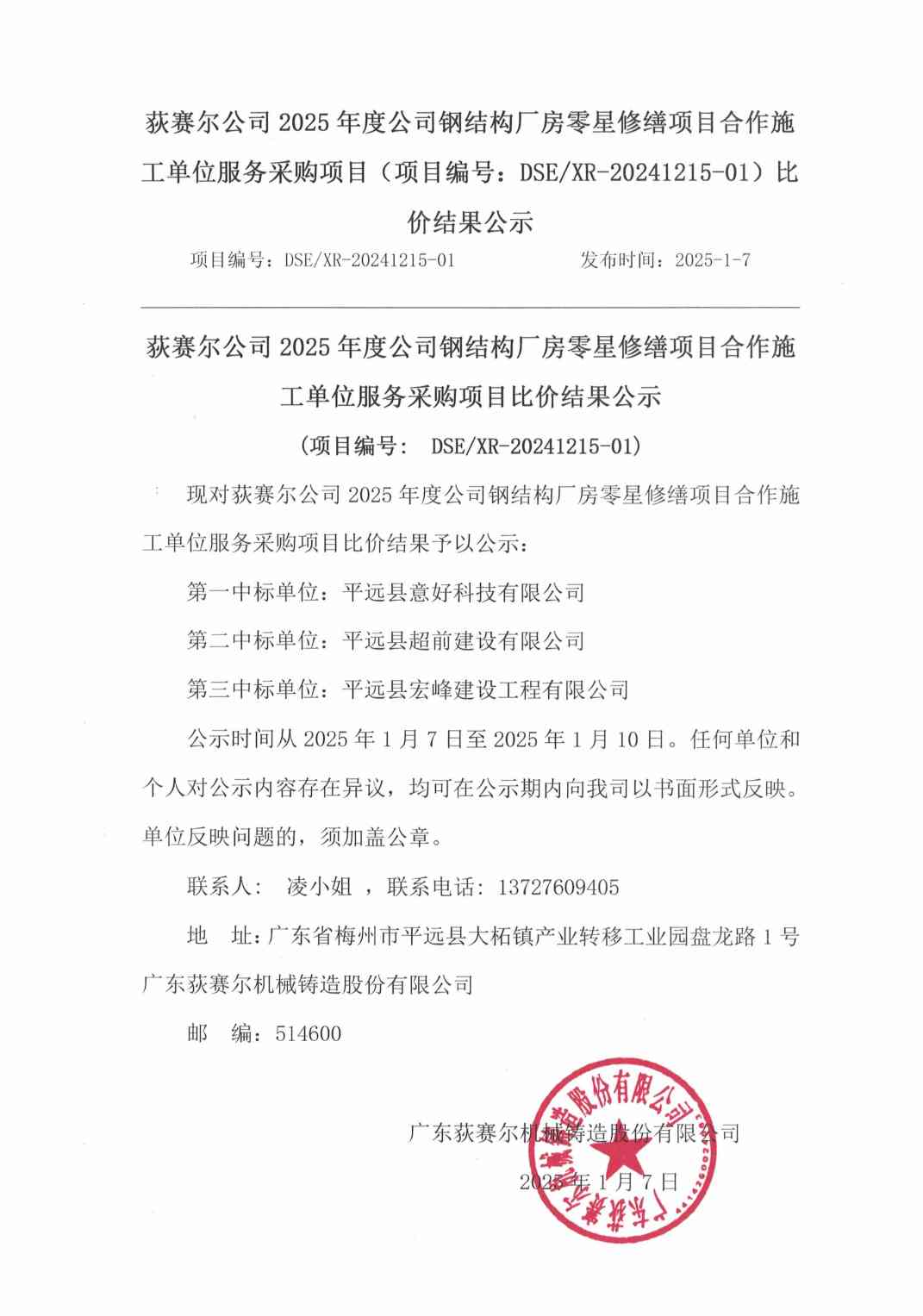 荻赛尔公司2025年度公司钢结构厂房零星修缮项目合作施工单位服务采购项目比价结果公示