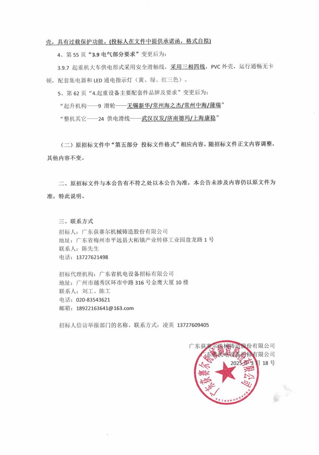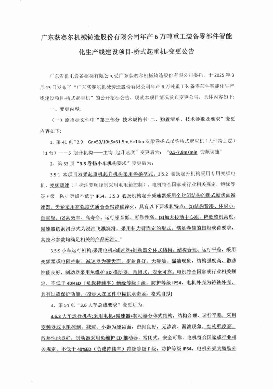 广东荻赛尔机械铸造股份有限公司年产6万吨重工装备零部件智能化生产线建设项目-桥式起重机-变更公告