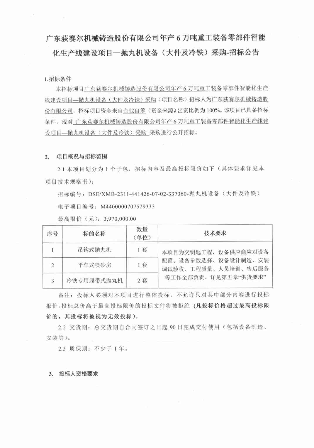 广东荻赛尔机械铸造股份有限公司年产6万吨重工装备零部件智能化生产线建设项目—抛丸机设备(大件及 冷铁)采购-招标公告