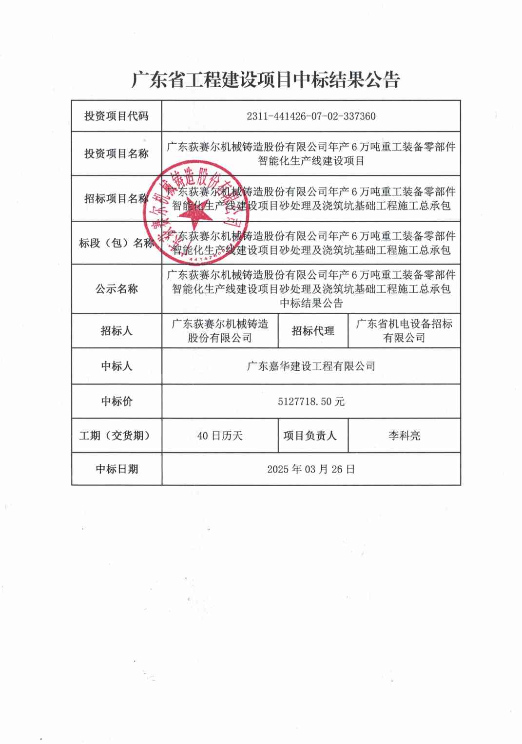 广东荻赛尔机械铸造股份有限公司年产6万吨重工装备零部件智能化生产线建设项目砂处理及浇筑坑基础工程施工总承包中标结果公告