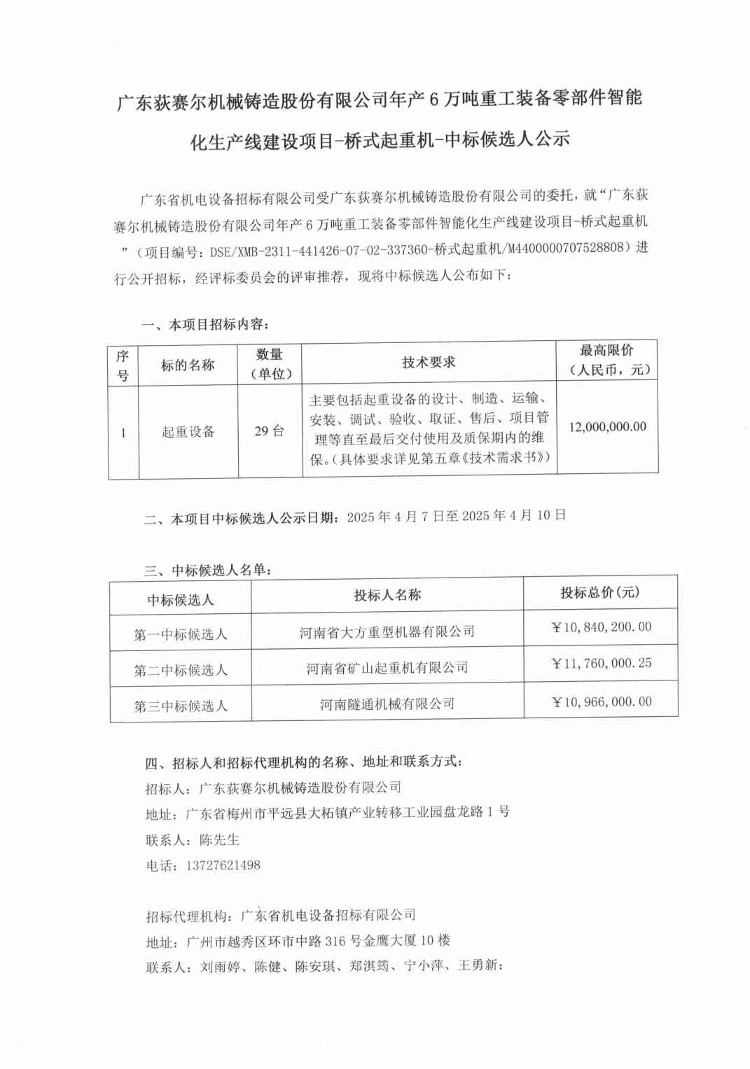 广东荻赛尔机械铸造股份有限公司年产6万吨重工装备零部件智能化生产线建设项目-桥式起重机-中标候选人公示