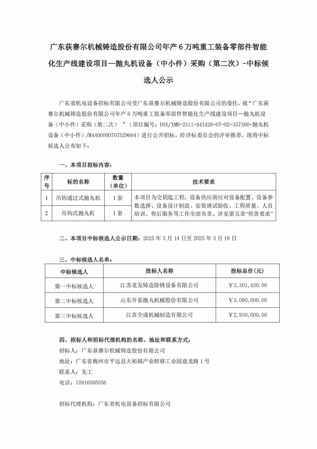 广东荻赛尔机械铸造股份有限公司年产6万吨重工装备零部件智能化生产线建设项目—抛丸机设备(中小件)采购(第二次)-中标候选人公示