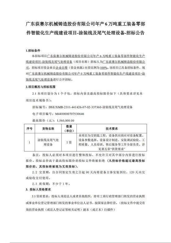 广东荻赛尔机械铸造股份有限公司年产6万吨重工装备零部件智能化生产线建设项目-涂装线及尾气处理设备-招标公告