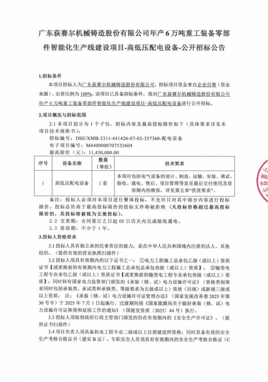 广东荻赛尔机械铸造股份有限公司年产6万吨重工装备零部件智能化生产线建设项目-高低压配电设备-公开招标公告