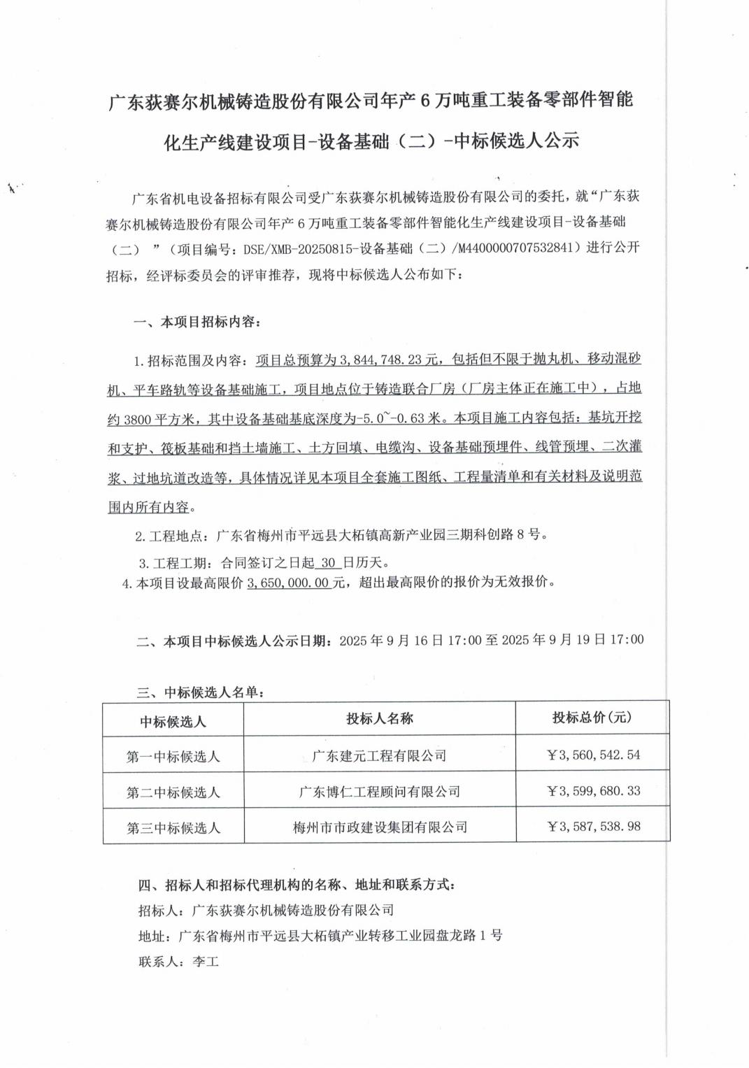 广东荻赛尔机械铸造股份有限公司年产6万吨重工装备零部件智能化生产线建设项目-设备基础(二)-中标候选人公示