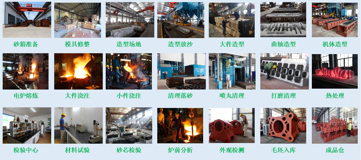 公司主要铸造产品有船用大型柴油机、大型注塑机、大型水泵、大型加工机械等系列铸件。年生产能力3万吨,以球墨铸铁、灰口铸铁和蠕墨铸铁为主,生产球墨铸铁件最大单件铸件重量50吨。公司拥有较强的、反应快速的研发、生产能力。