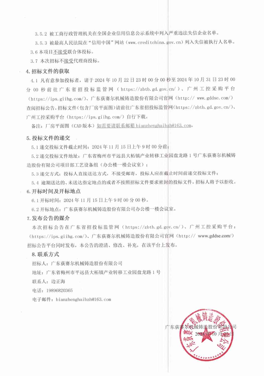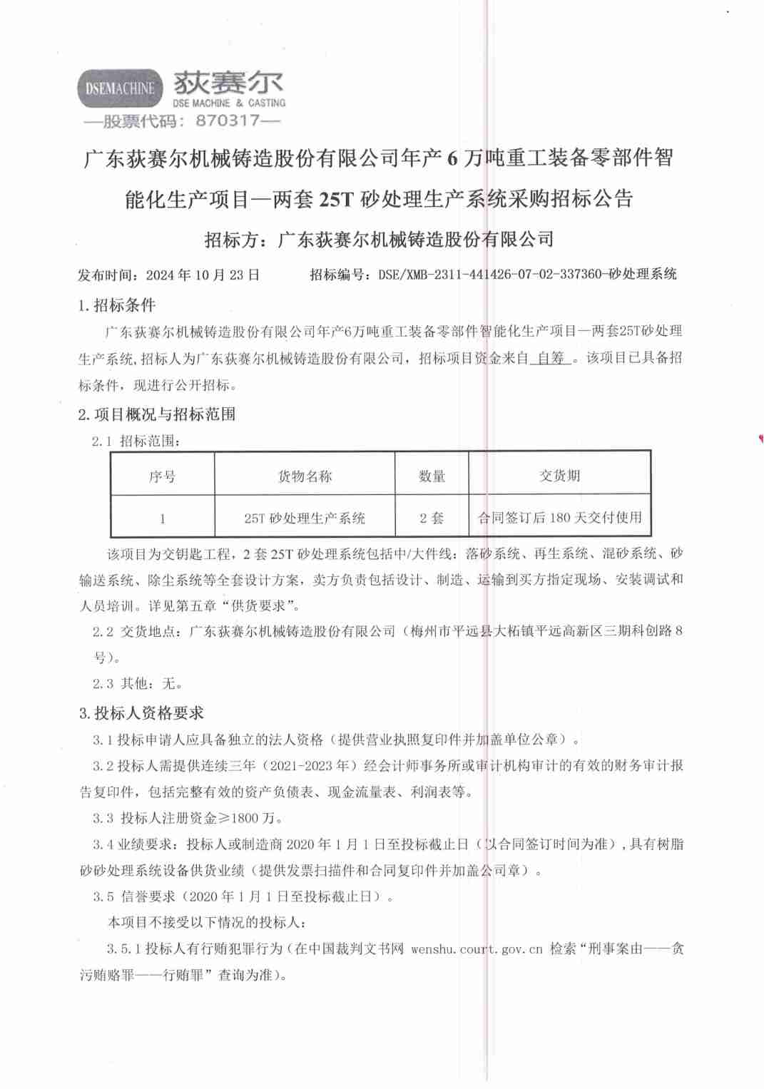 广东荻赛尔机械铸造股份有限公司年产6万吨重工装备零部件智能化生产项目—两套25T砂处理生产系统采购招标公告
