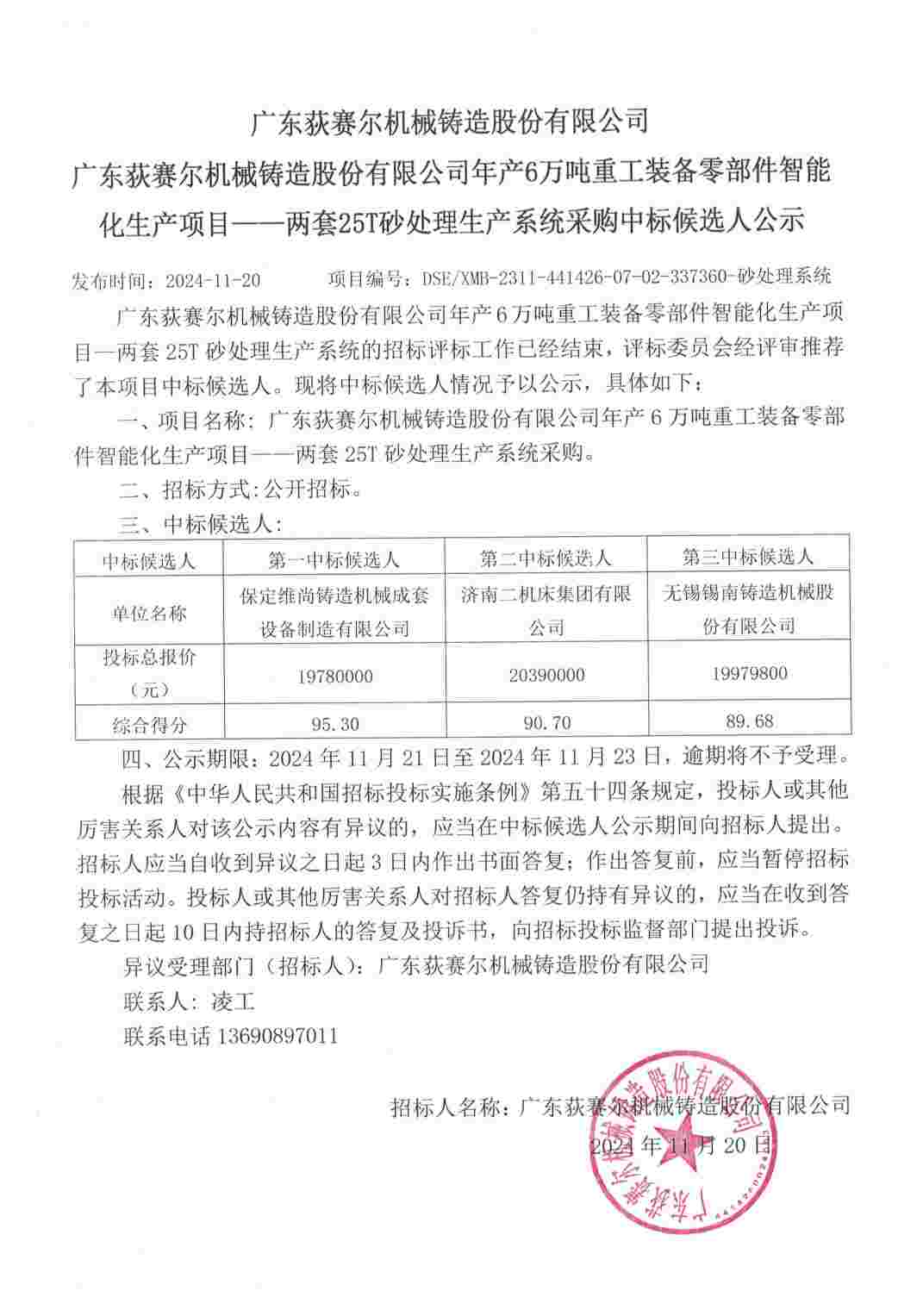 年产6万吨重工装备零部件智能化生产项目——两套25T砂处理生产系统采购中标候选人公示