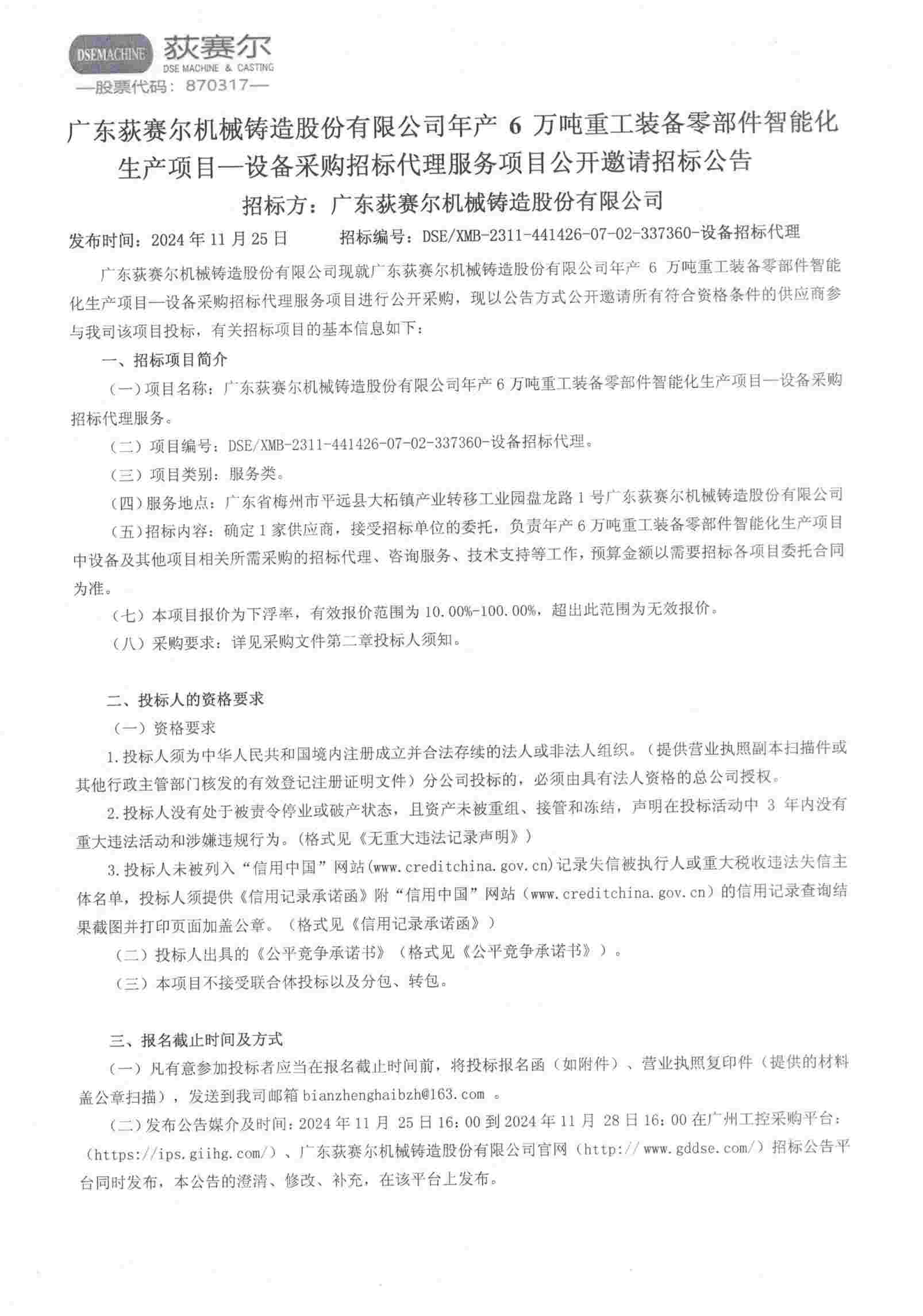 荻赛尔公司年产6万吨重工装备零部件智能化生产项目-设备采购招标代理服务项目公开邀请招标公告