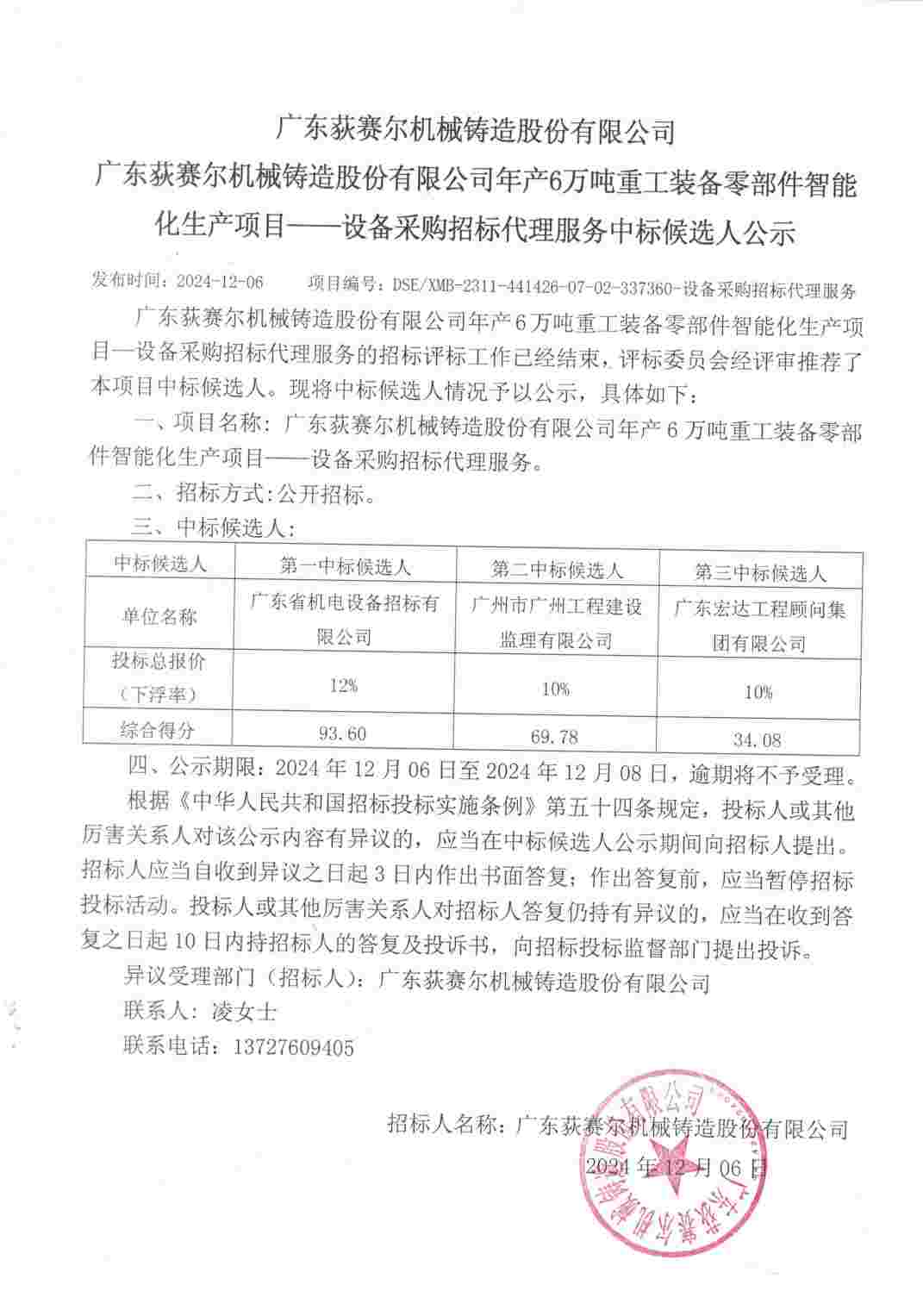 荻赛尔年产6万吨重工装备零部件智能化生产项目-设备采购招标代理服务中标候选人公示