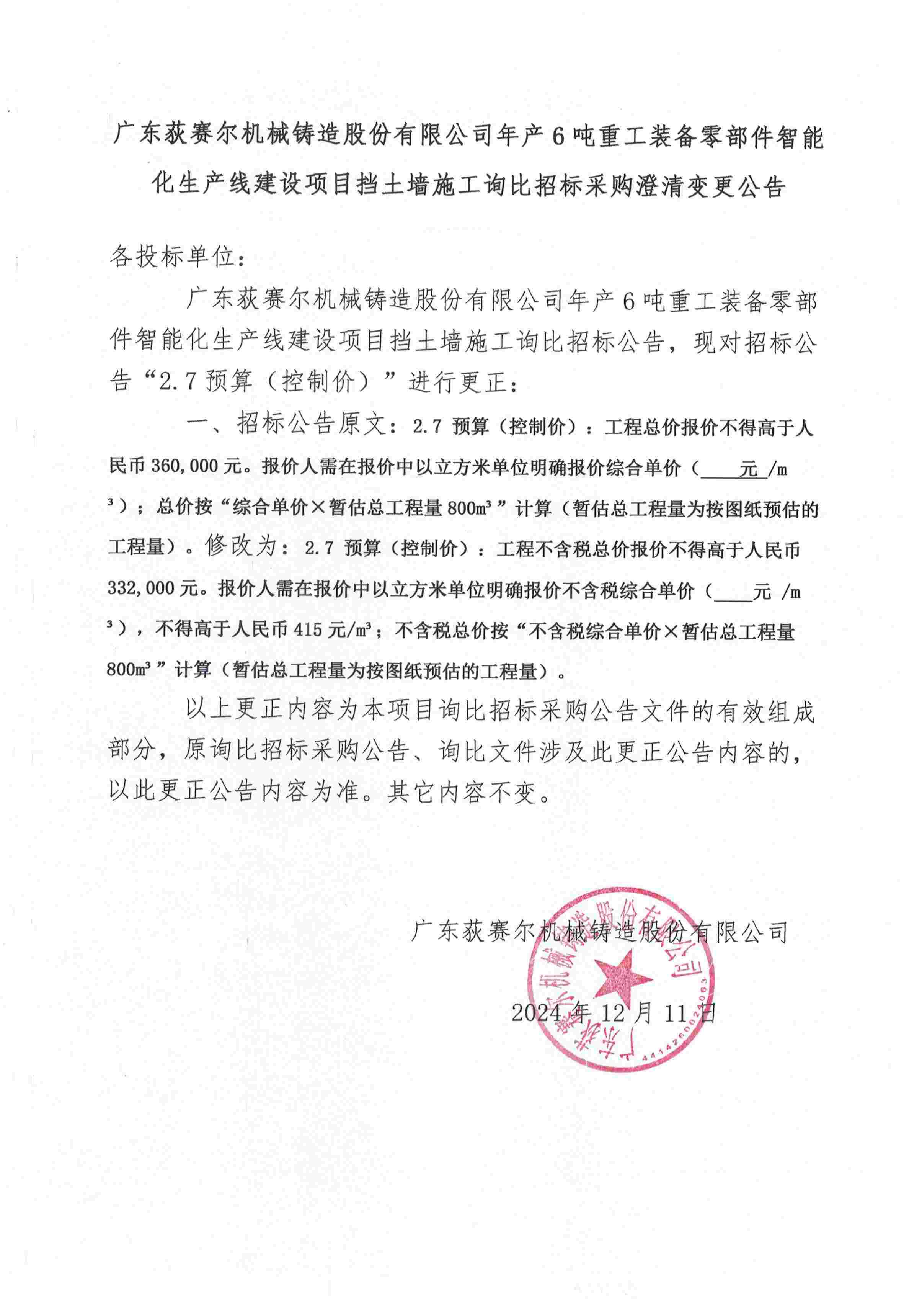 广东荻赛尔机械铸造股份有限公司年产6吨重工装备零部件智能化生产线建设项目挡土墙施工询比招标采购澄清变更公告