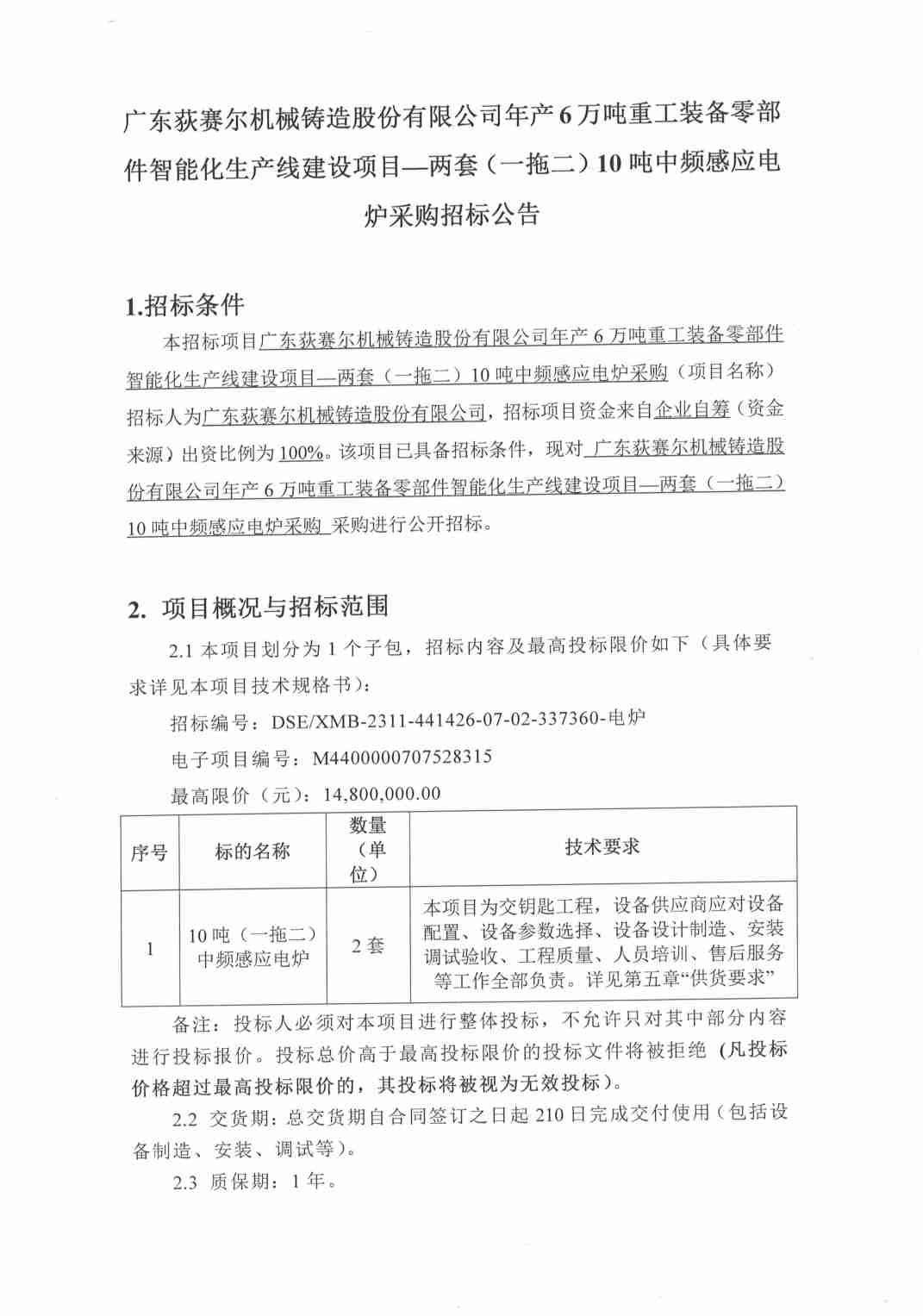 广东荻赛尔机械铸造股份有限公司年产6万吨重工装备零部件智能化生产线建设项目—两套(一拖二)10吨中频感应电炉采购招标公告