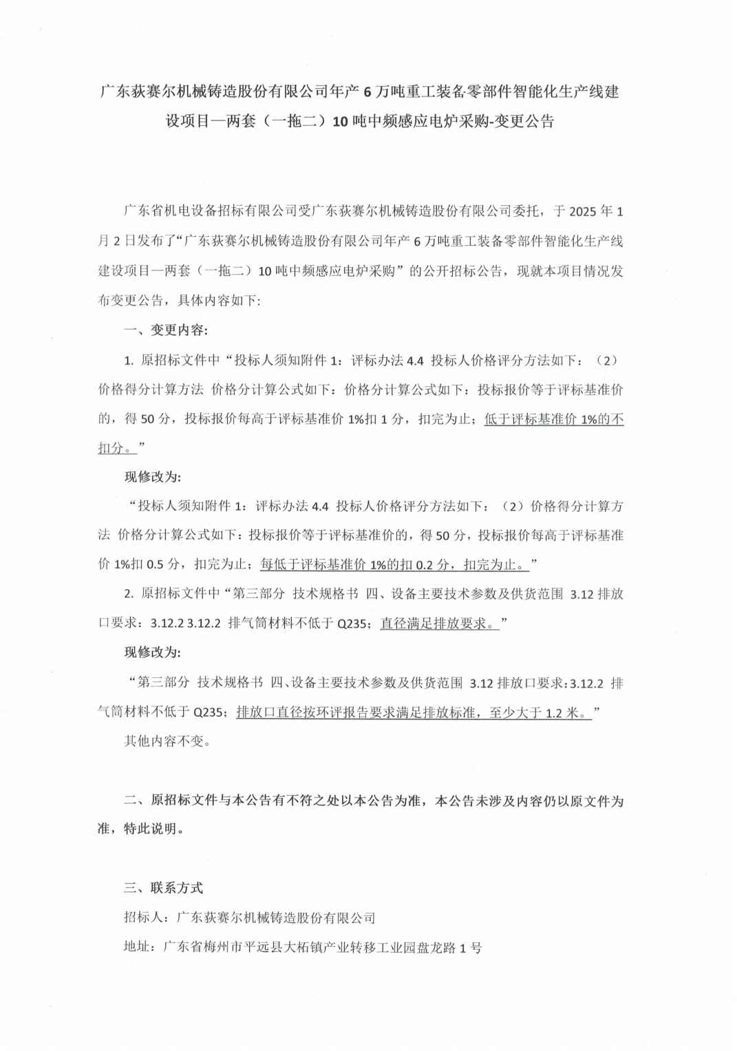 广东荻赛尔机械铸造股份有限公司年产6万吨重工装备零部件智能化生产线建设项目—两套(一拖二)10吨 中频感应电炉采购-变更公告