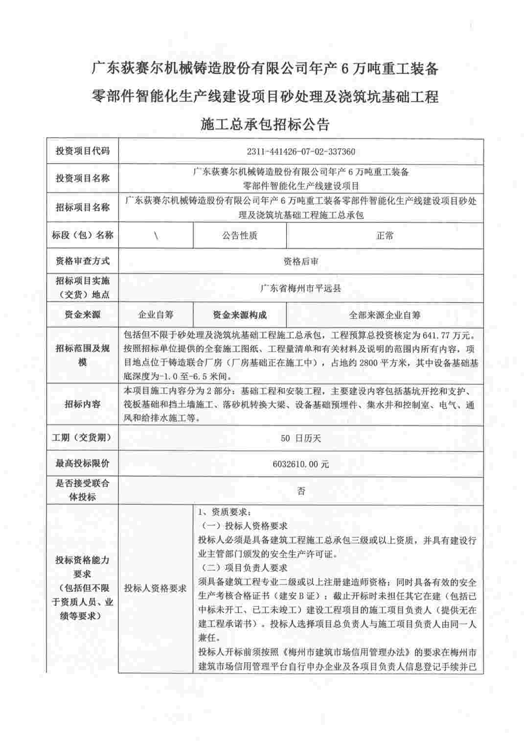 广东荻赛尔机械铸造股份有限公司年产6万吨重工装备零部件智能化生产线建设项目砂处理及浇筑坑基础工程施工总承包招标公告
