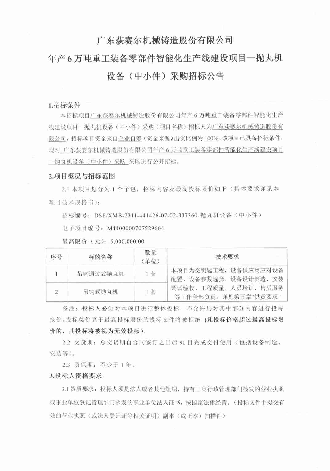 广东荻赛尔机械铸造股份有限公司年产6万吨重工装备零部件智能化生产线建设项目—抛丸机设备(中小件)采购招标公告