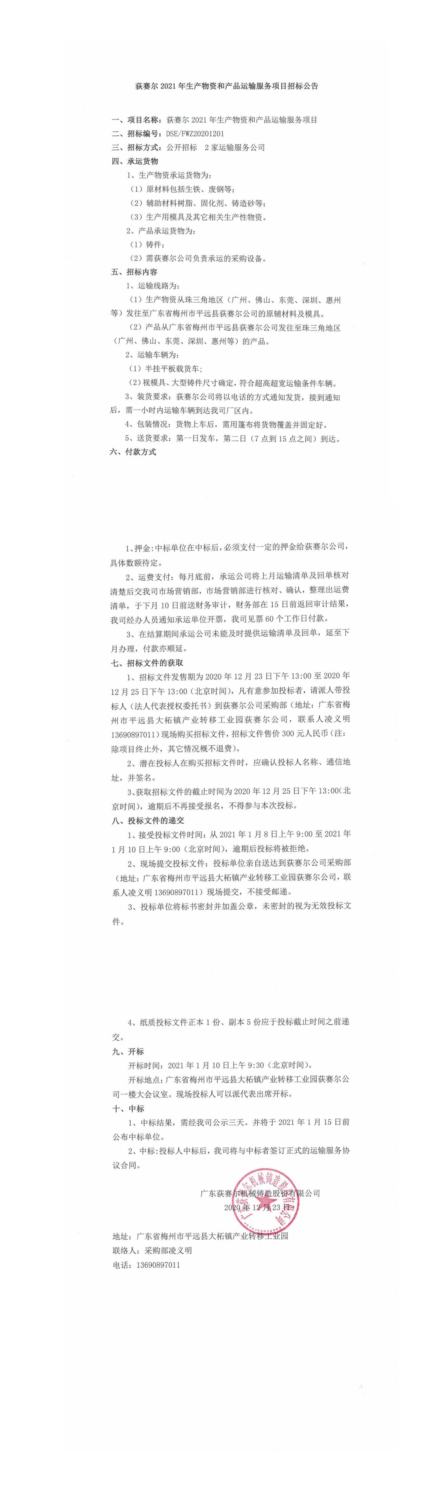 荻赛尔2021年生产物资和产品运输服务项目招标公告