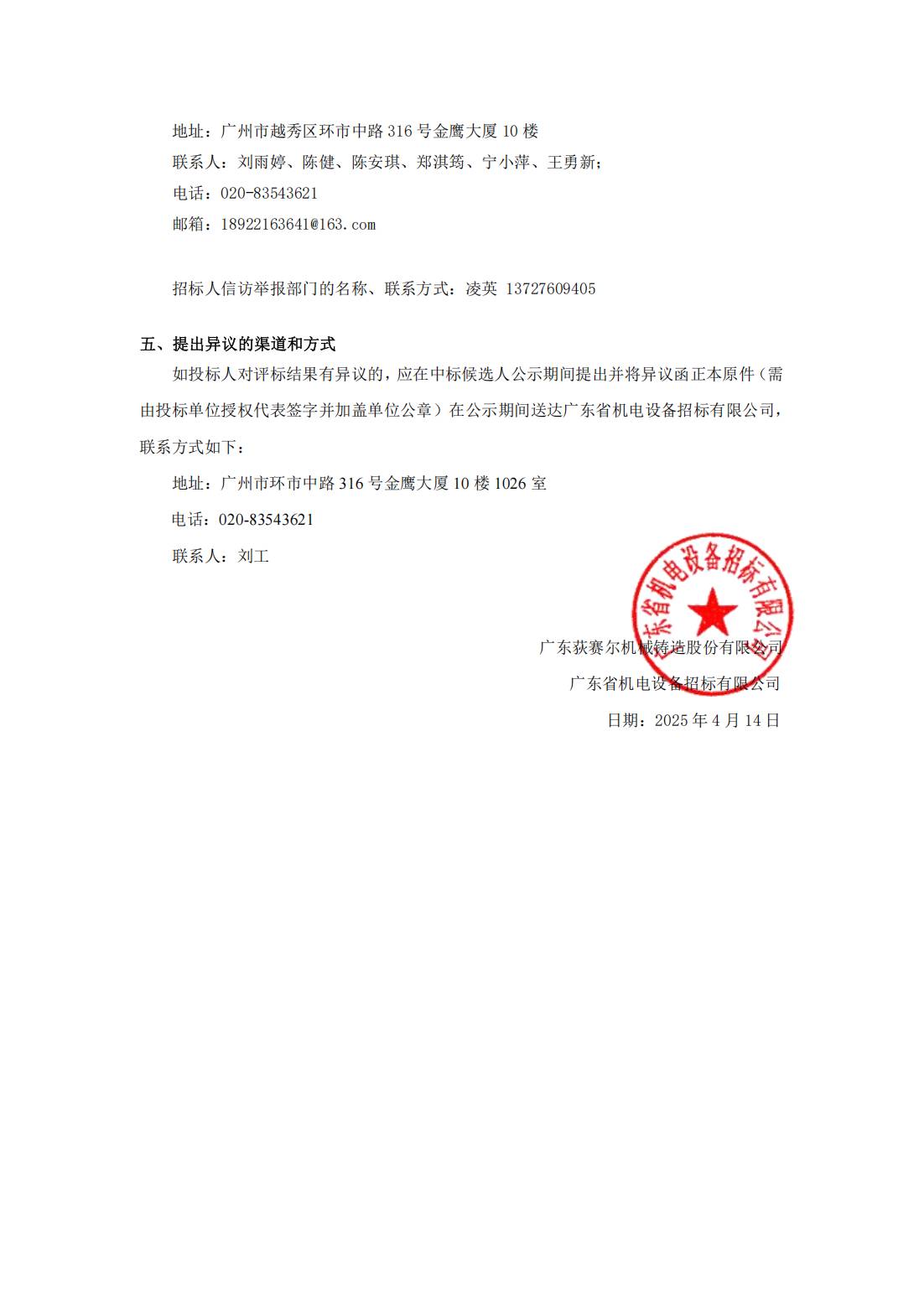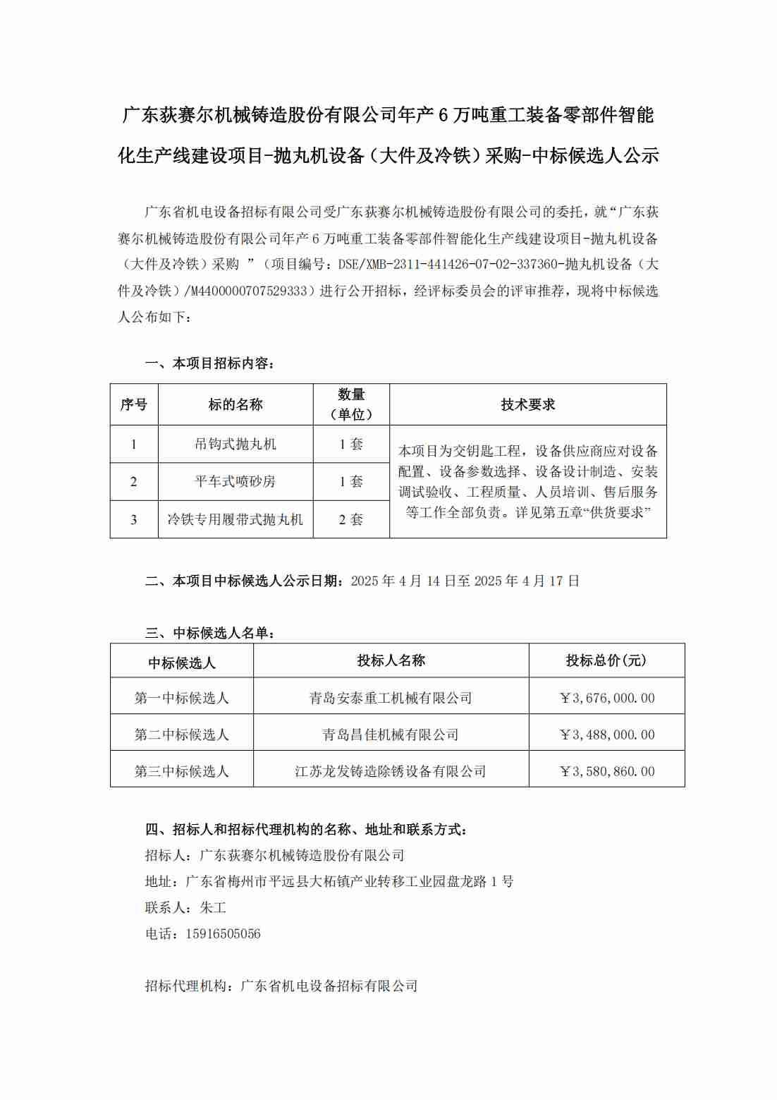 广东荻赛尔机械铸造股份有限公司年产6万吨重工装备零部件智能化生产线建设项目-抛丸机设备(大件及冷铁)采购-中标候选人公示