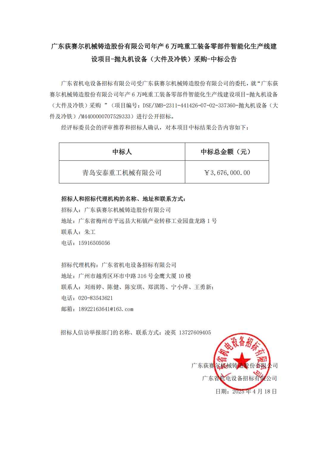 广东荻赛尔机械铸造股份有限公司年产6万吨重工装备零部件智能化生产线建设项目-抛丸机设备(大件及 冷铁)采购-中标公告
