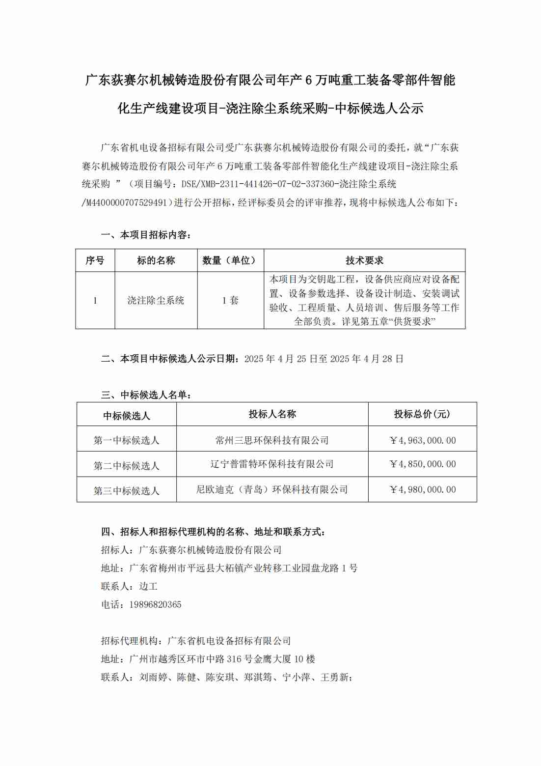 广东荻赛尔机械铸造股份有限公司年产6万吨重工装备零部件智能化生产线建设项目-浇注除尘系统采购-中标候选人公示