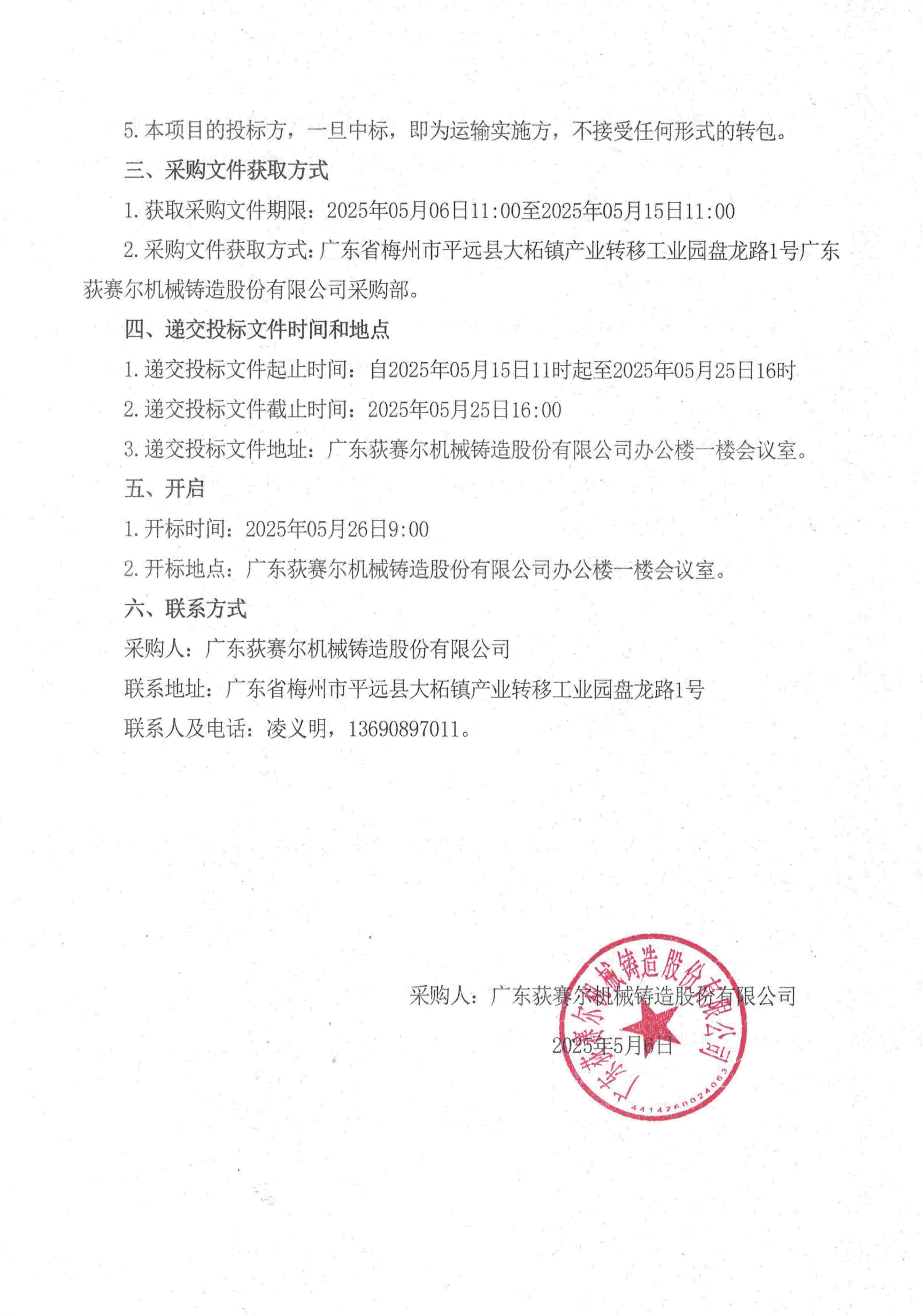 广东荻赛尔机械铸造股份有限公司2025年7月1日至2026年6月30日期间 物资运输物流(包含产品和原材料及模具)服务招标采购公告