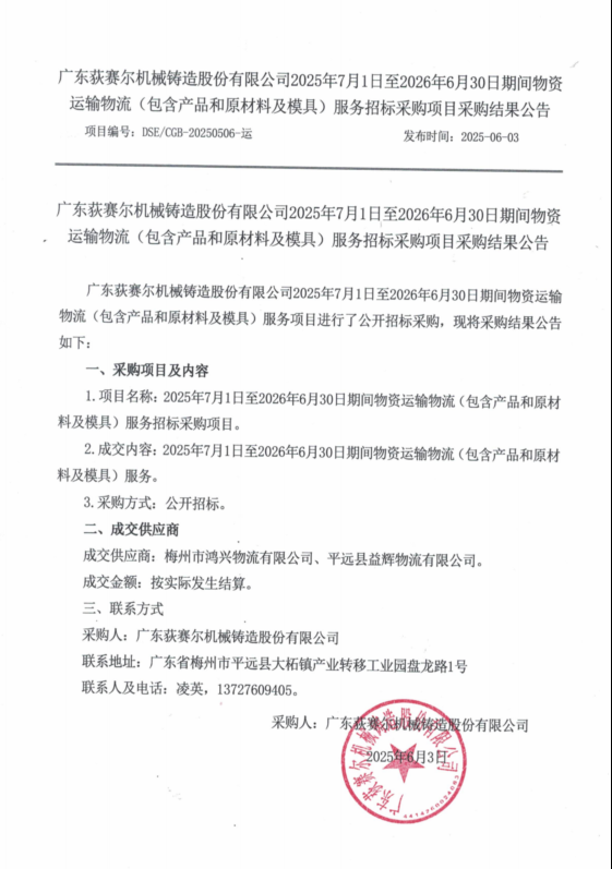 广东荻赛尔机械铸造股份有限公司2025年7月1日至2026年6月30日期间物资运输物流(包含产品和原材料及模具)服务招标采购项目采购结果公告