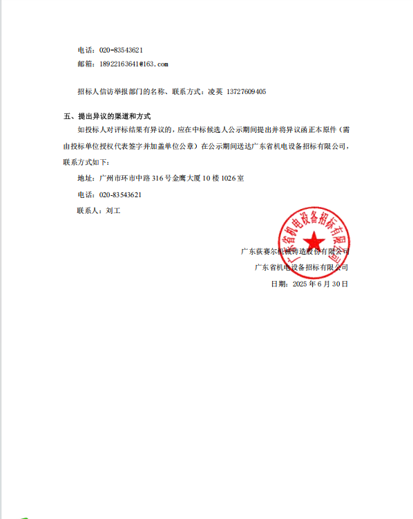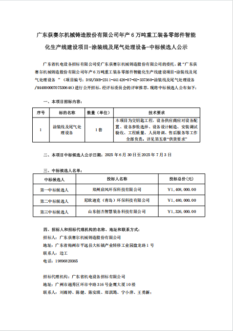 广东荻赛尔机械铸造股份有限公司年产6万吨重工装备零部件智能化生产线建设项目-涂装线及尾气处理设备-中标候选人公示