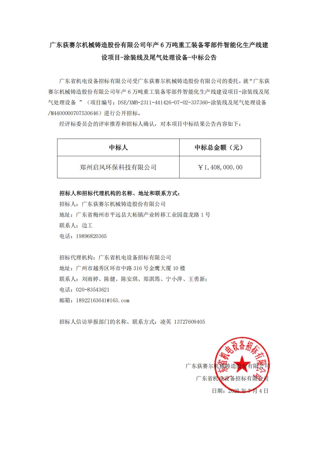 广东荻赛尔机械铸造股份有限公司年产6万吨重工装备零部件智能化生产线建设项目-涂装线及尾气处理设备-中标公告