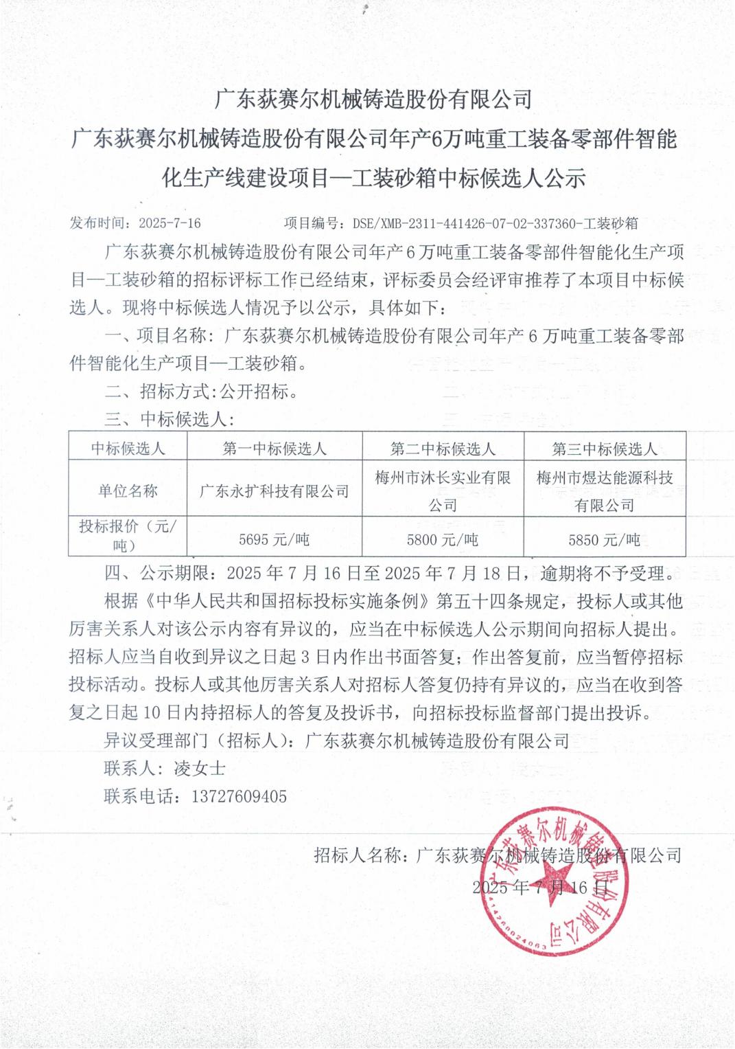 广东荻赛尔机械铸造股份有限公司年产6万吨重工装备零部件智能化生产线建设项目——工装砂箱中标候选人公示