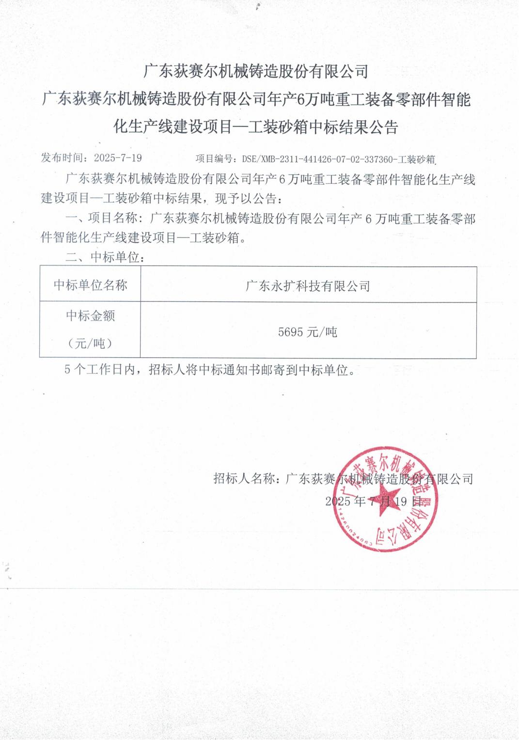 广东荻赛尔机械铸造股份有限公司年产6万吨重工装备零部件智能化生产线建设项目一工装砂箱中标结果公告