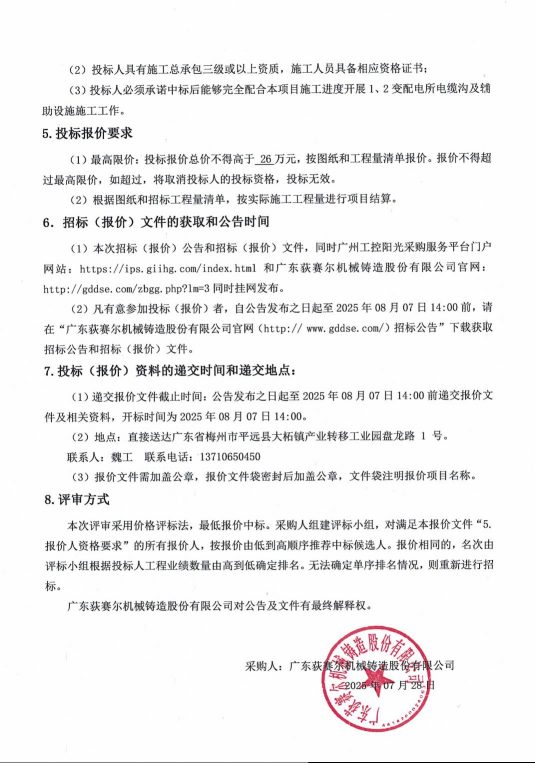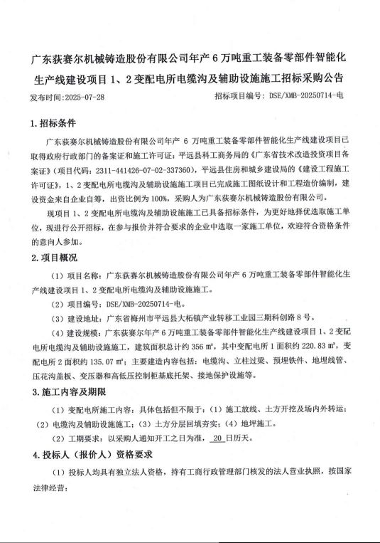 广东荻赛尔机械铸造股份有限公司年产6万吨重工装备零部件智能化——生产线建设项目1、2变配电所电缆沟及辅助设施施工招标公告