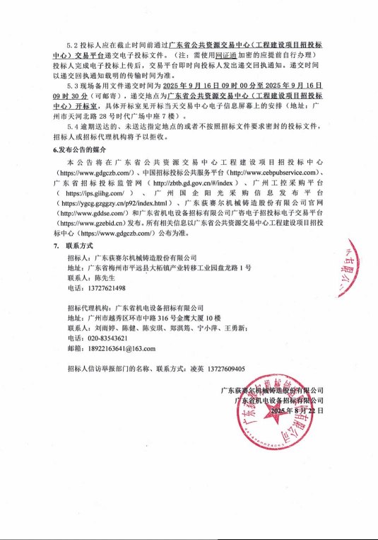 广东荻赛尔机械铸造股份有限公司年产6万吨重工装备零部件智能化生产线建设项目-高低压配电设备-公开招标公告