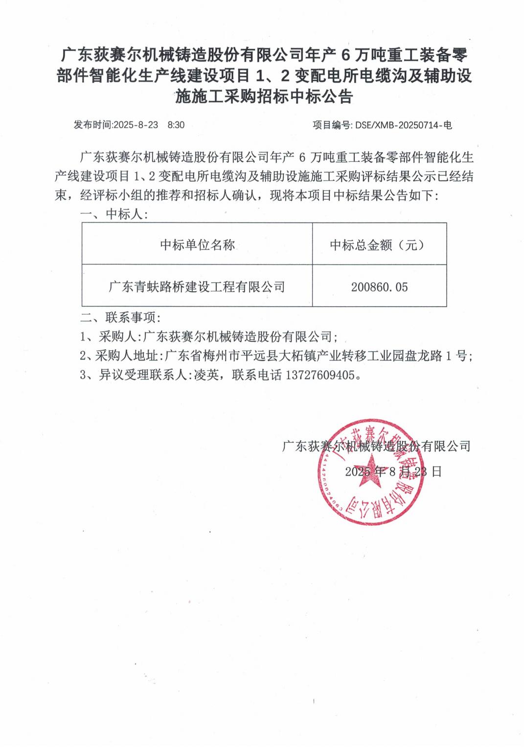 广东荻赛尔机械铸造股份有限公司年产6万吨重工装备零部件智能化生产线建设项目1、2变配电所电缆沟及辅助设施施工采购招标中标公告