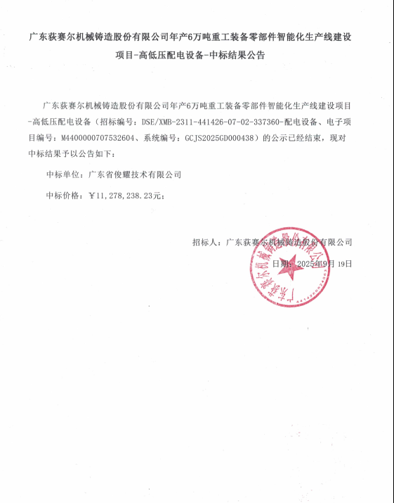 广东荻赛尔机械铸造股份有限公司年产6万吨重工装备零部件智能化生产线建设项目-高低压配电设备-中标结果公告