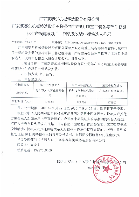 广东荻赛尔机械铸造股份有限公司年产6万吨重工装备零部件智能化生产线建设项目一钢轨及安装中标候选人公示