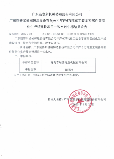 广东荻赛尔机械铸造股份有限公司年产6万吨重工装备零部件智能化生产线建设项目一铁水包中标结果公告