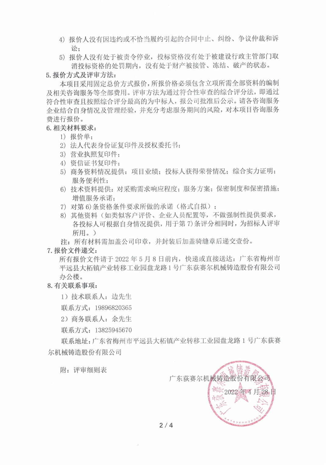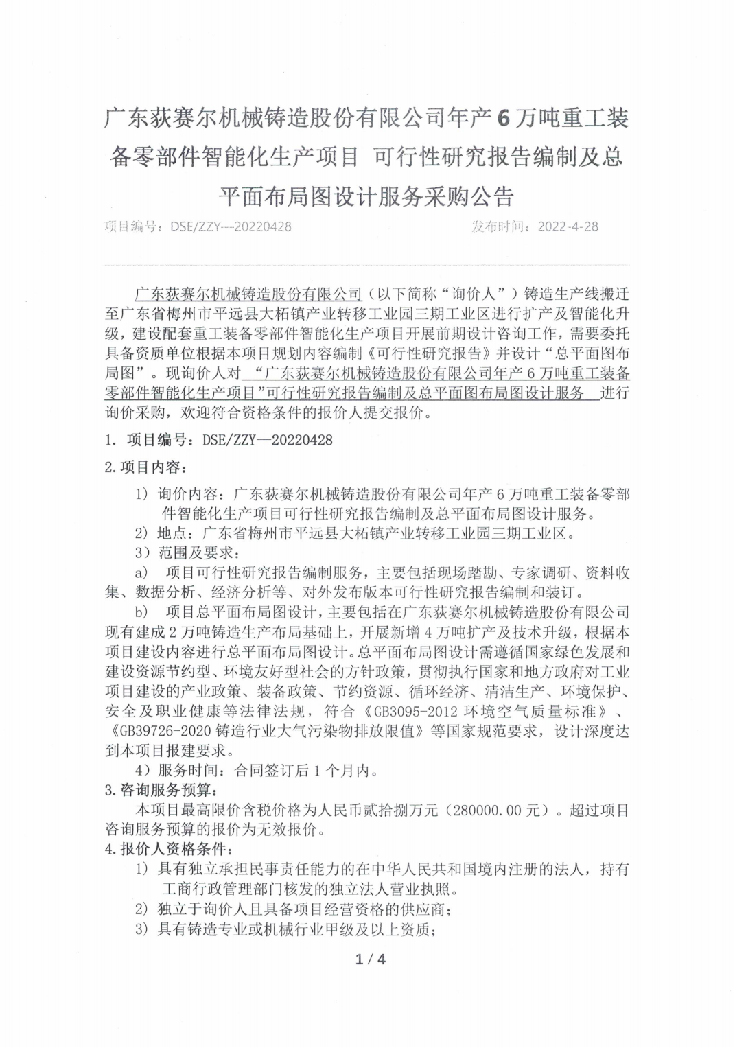 广东荻赛尔机械铸造股份有限公司年产6万吨重工装备零部件智能化生产项目 可行性研究报告编制及总平面布局图设计服务采购公告