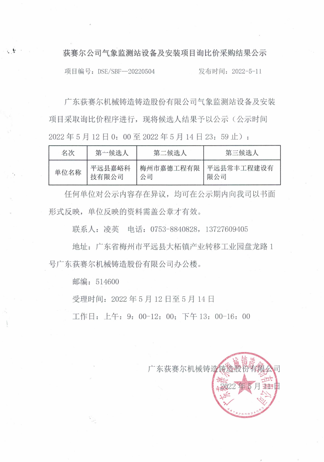 荻赛尔公司生产气象监测站设备及安装项目询比价采购结果公示