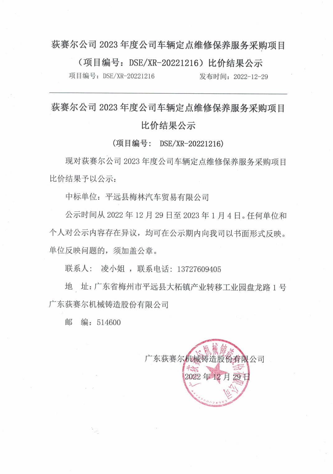 荻赛尔公司2023年度公司车辆定点维修保养服务采购项目采购项目比价结果公示