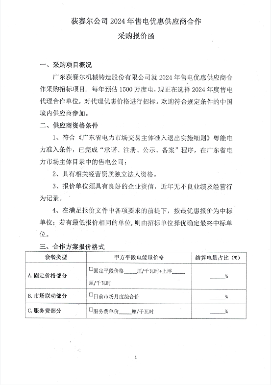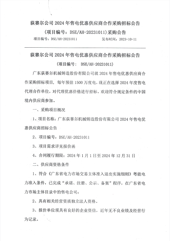 荻赛尔公司2024年售电优惠供应商合作采购招标公告