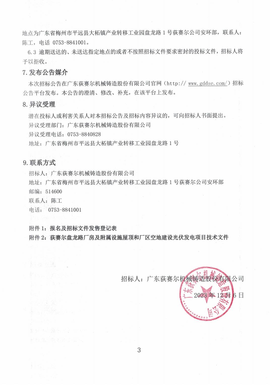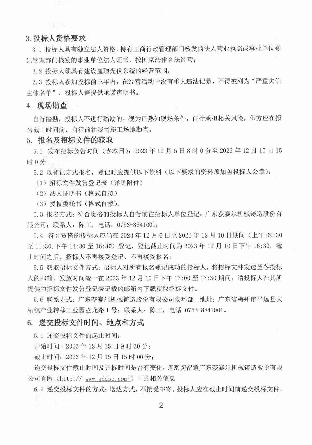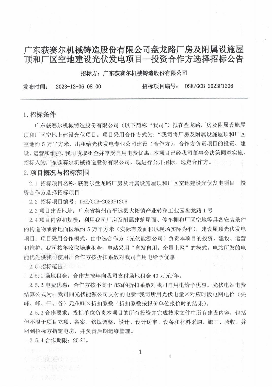 广东荻赛尔机械铸造股份有限公司盘龙路厂房及附属设施屋顶和厂区空地建设光伏发电项目—投资合作方选择招标公告