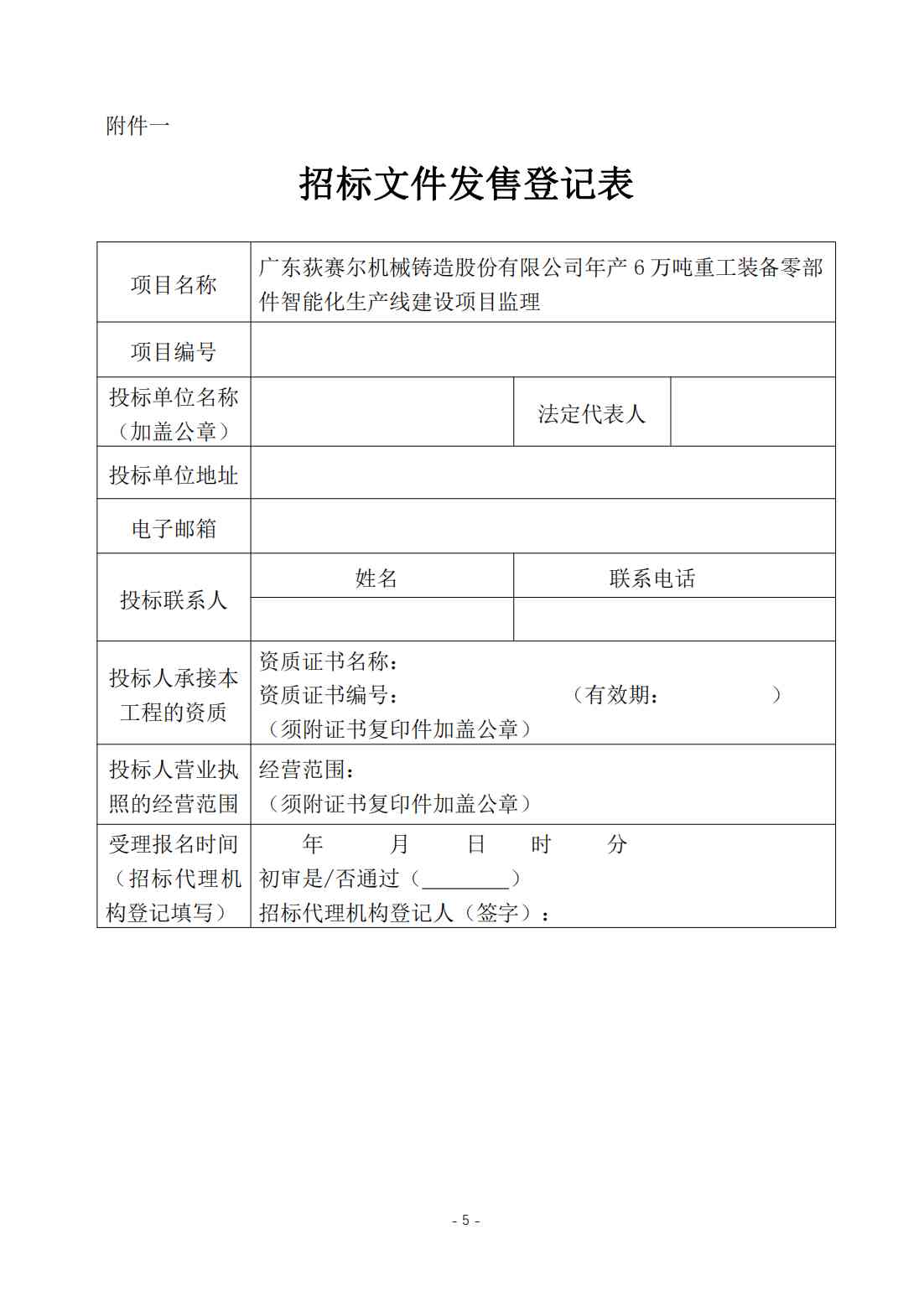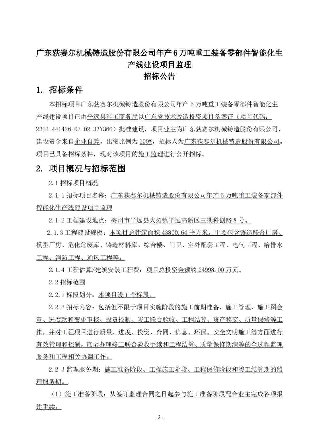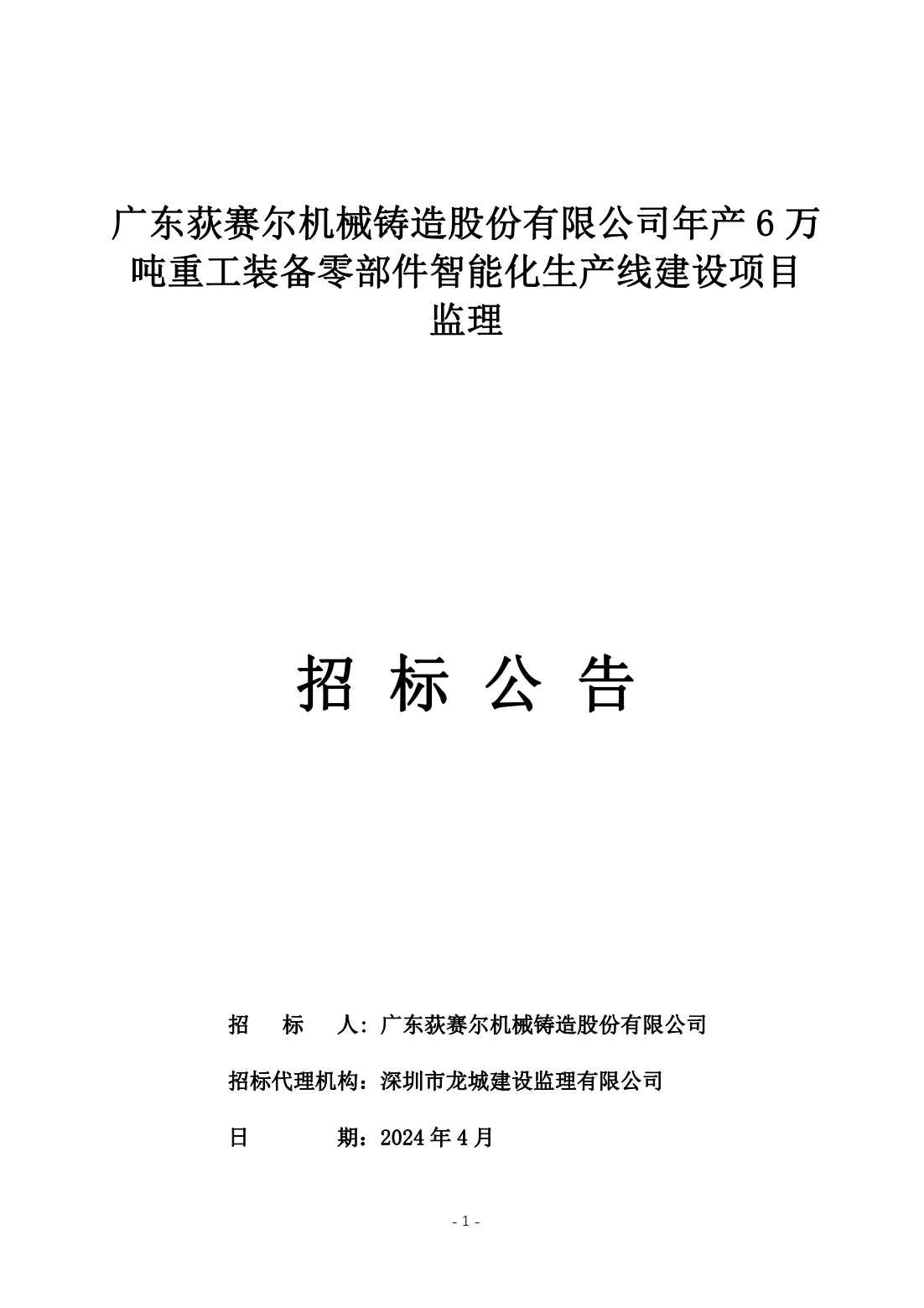 招标公告:广东荻赛尔机械铸造股份有限公司年产6万吨重工装备零部件智能化生产线建设项目监理