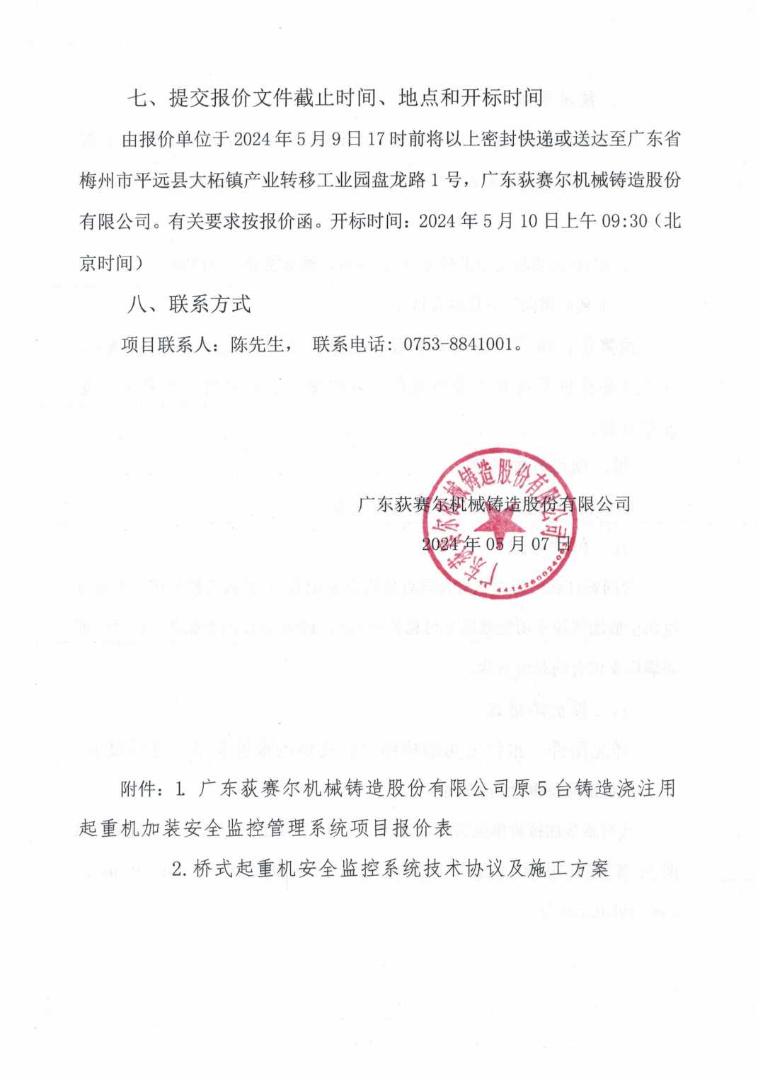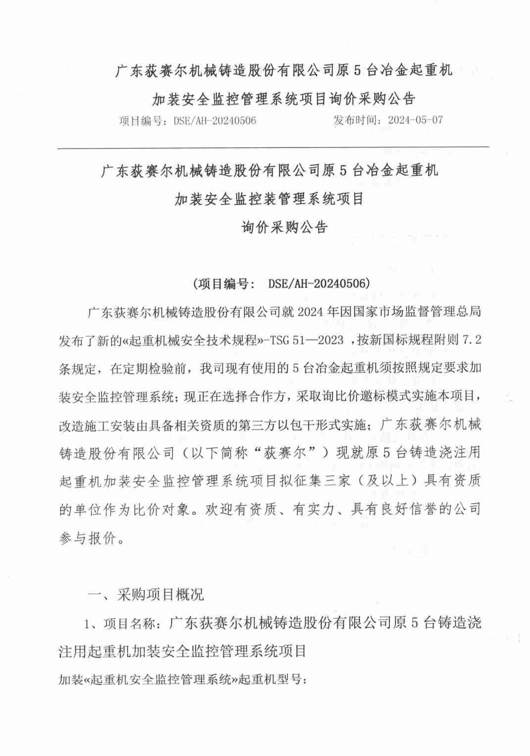 广东荻赛尔机械铸造股份有限公司原5台冶金起重机加装安全监控管理系统项目询价采购公告