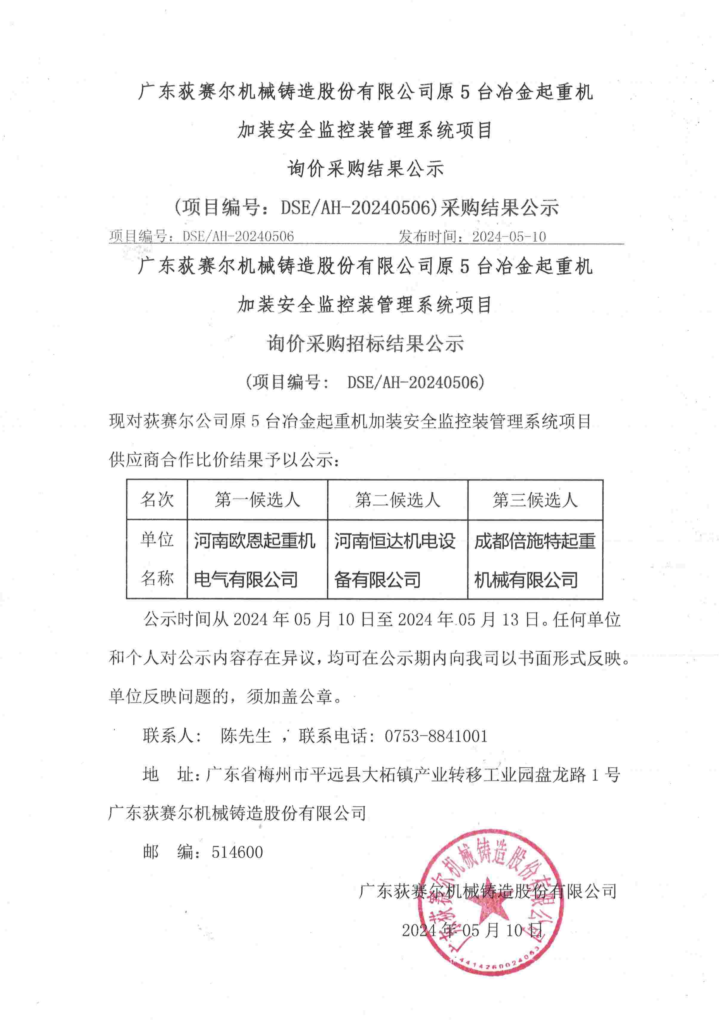 广东荻赛尔机械铸造股份有限公司原5台冶金起重机加装安全监控装管理系统项目 询价采购招标结果公示