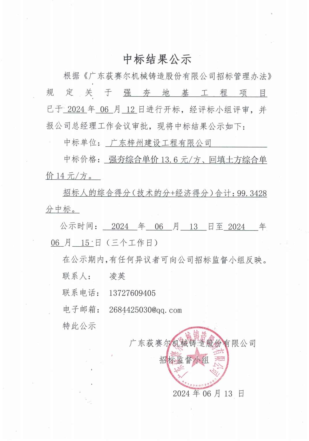 《年产6万吨重工装备零部件智能化生产建设项目》强夯地基工程项目中标结果公示