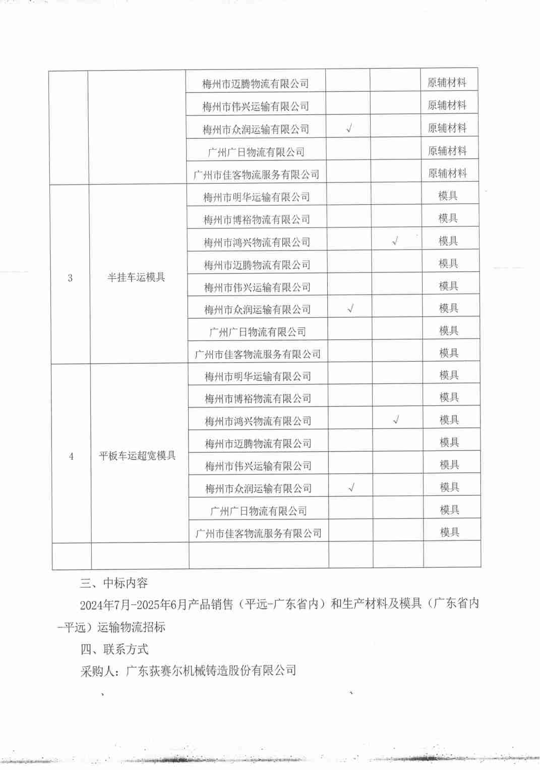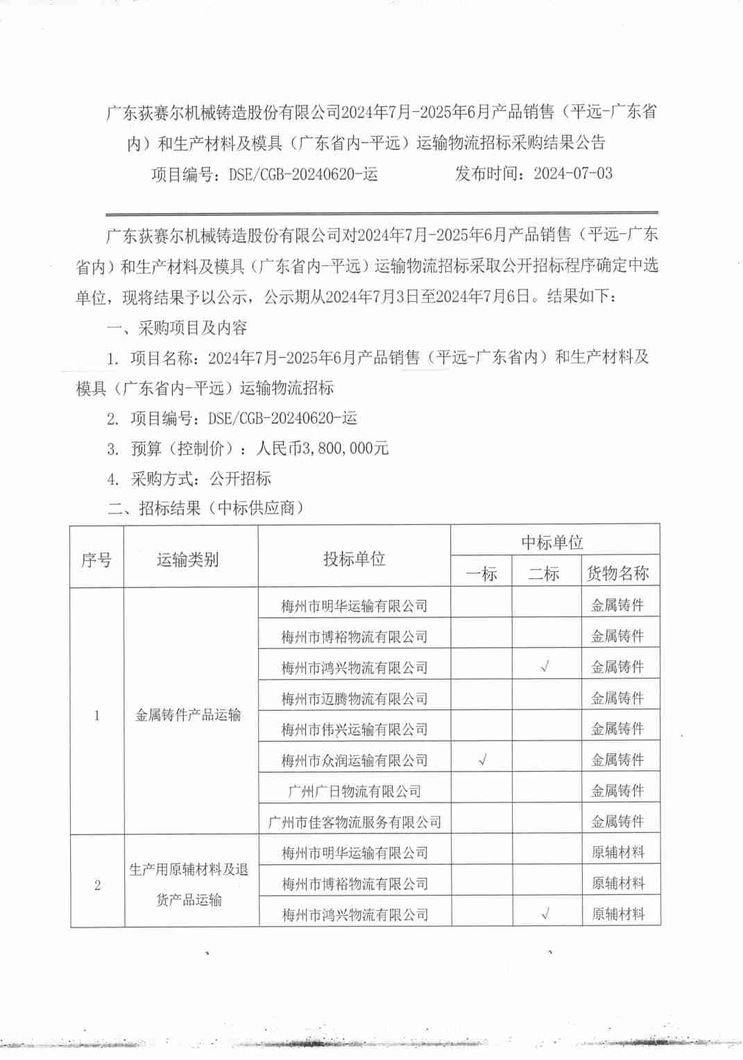 荻赛尔2024年7月-2025年6月运输物流招标采购结果公告