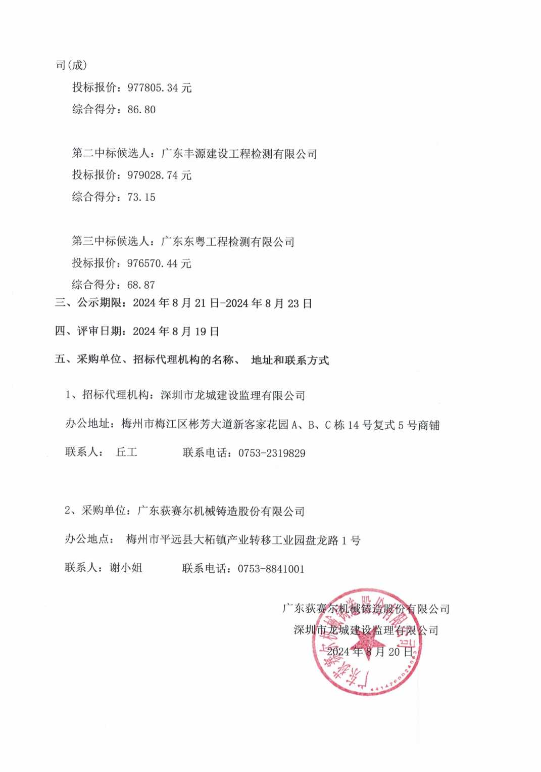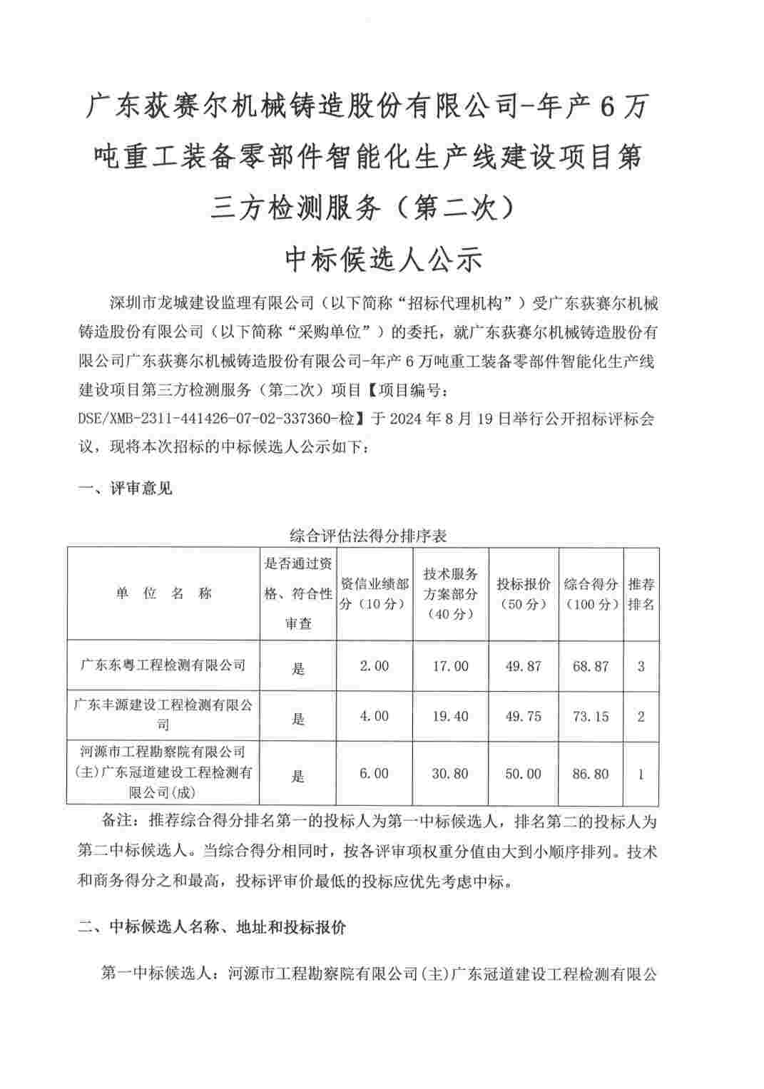 年产6万吨重工装备零部件智能化生产线建设项目第三方检测服务(第二次)中标候选人公示
