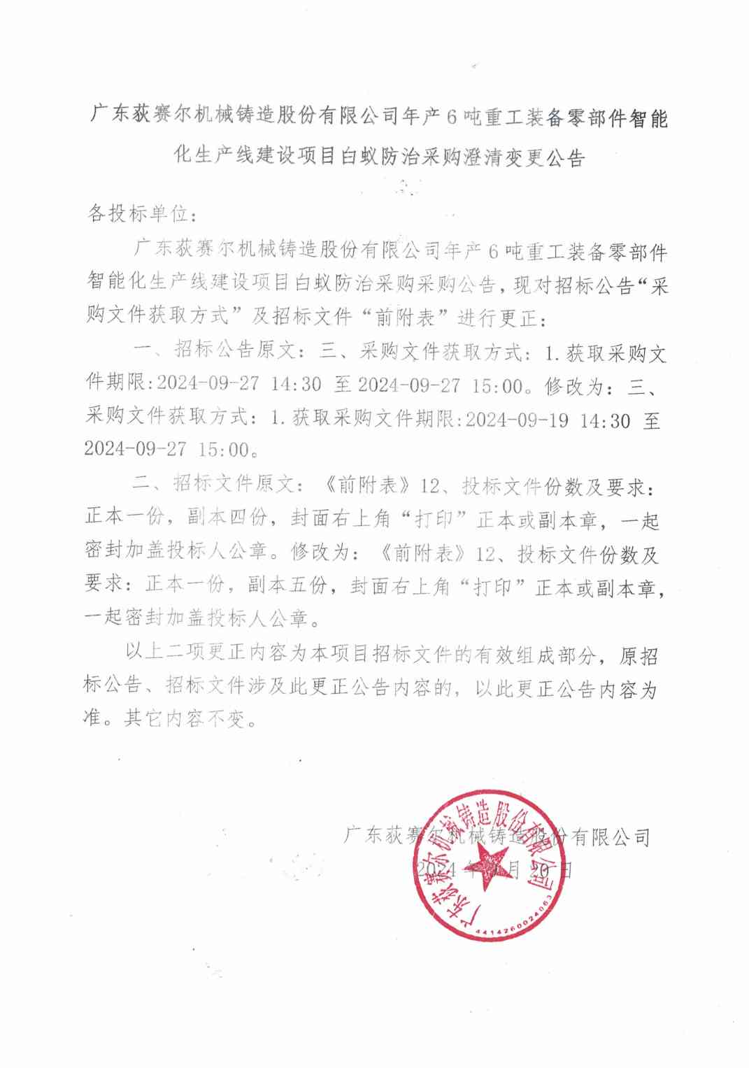年产6吨重工装备零部件智能化生产线建设项目白蚁防治采购澄清变更公告